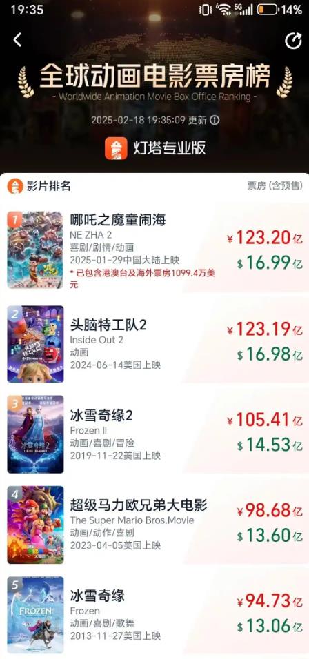 【《哪吒2》成全球动画电影票房榜第1】正在热映的《哪吒之魔童闹海》(《哪吒2》)正以惊艳之姿进入全球视野。今(18)日,《哪吒2》总票房(含海外)突破123.19亿元,超越《冰雪奇缘2》《头脑特工队2》等好莱坞大片,登顶全球动画电影票房榜冠军宝座,创造了中国动画电影的历史性成绩。